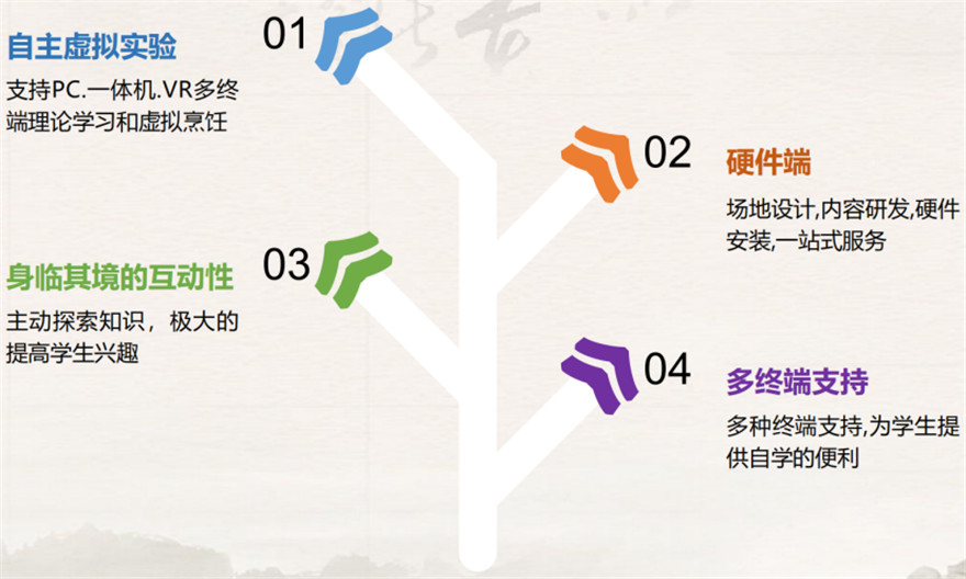 本著高效、節約、綠色的原則,攜手烹飪多位專家,鼎泰科技VR烹飪文化系統解決學生與教師在文化教育組織困難、學習形式單一、培訓成果無法展示等問題,與時俱進以沉浸式、互動性的體驗學習,讓學生穿越時空,讓歷史書本中的圖畫和文字“活起來”,讓學生和教師更加深刻了解古人傳承飲食文化的艱辛歷程,提高飲食文化素養。